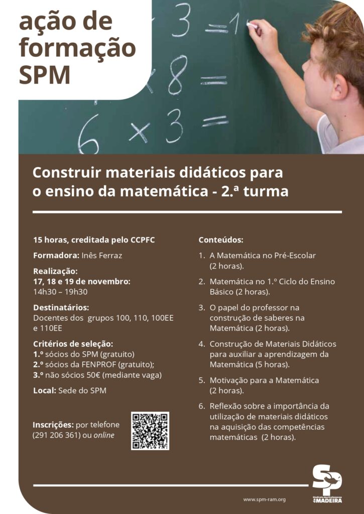 O desenvolvimento de conceitos matemático desde os primeiros anos de vida é fundamental para o sucesso escolar e a utilização de materiais didáticos potencia este sucesso. Esta é uma ação de formação de caráter prático, cujo principal objetivo é auxiliar os professores na construção de materiais didáticos que podem ser utilizados em contexto escolar. Estes materiais por terem uma componente lúdica permitem que os alunos aprendam os conteúdos da área de Matemática através da resolução de exercícios interativos. Pretende-se, nesta formação, capacitar os professores para a utilização destes recursos com os seus alunos, possibilitando a elaboração de materiais de fácil construção e manuseamento, desenvolvendo entre os formandos maior confiança e segurança na adoção de práticas inovadoras e transformadoras.